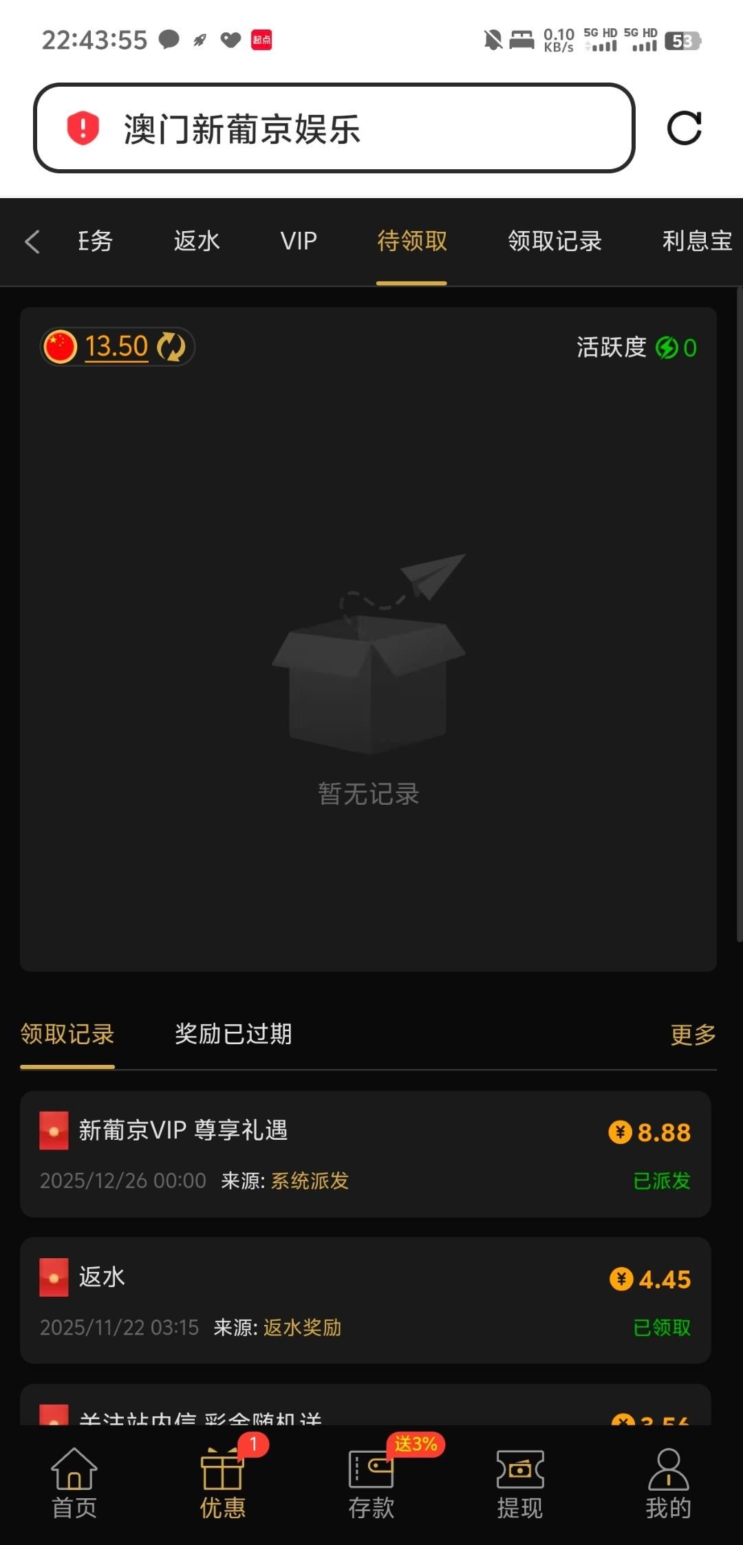 新葡京尊享礼遇彩金,有号可以上去看看,这个之前充值过100,536.vip
