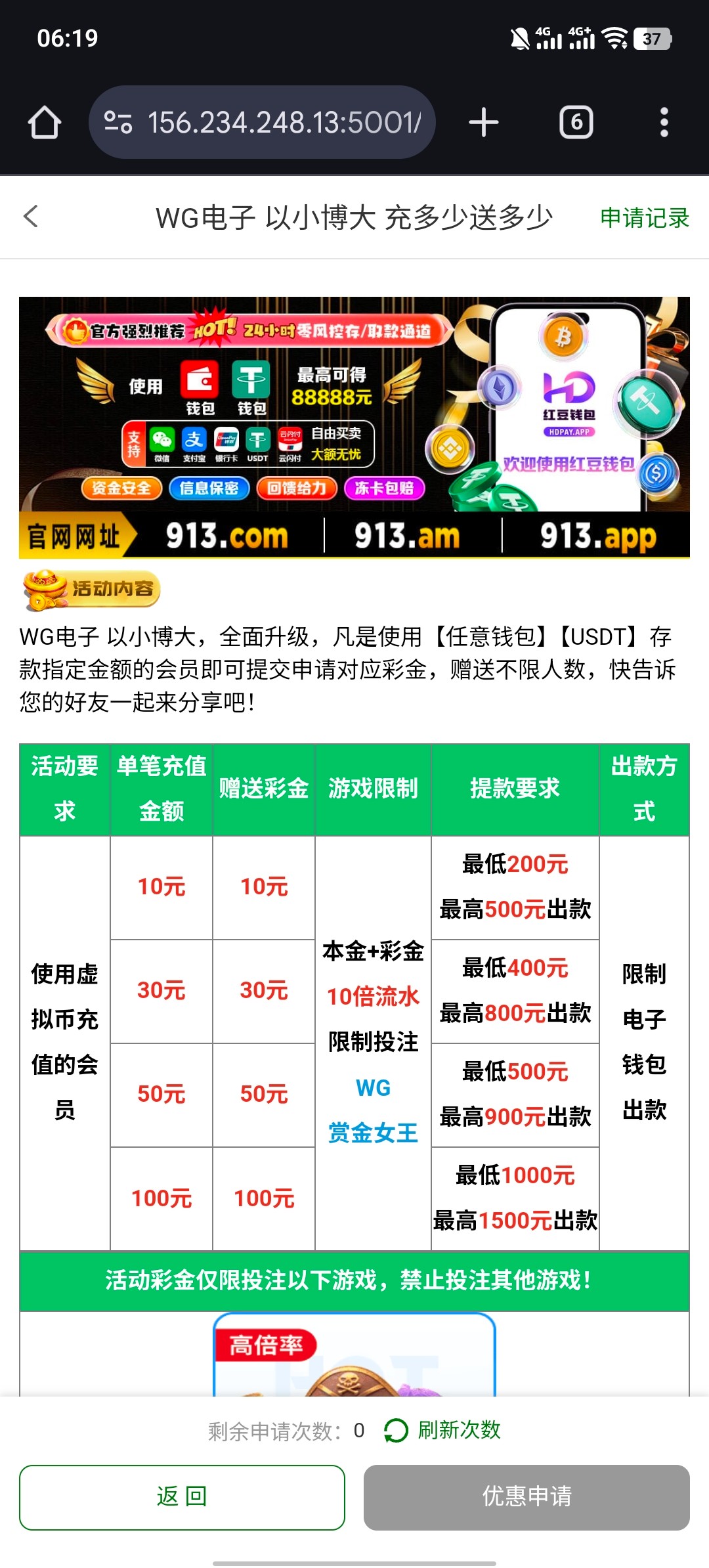 usdt充值 不低于11块钱 才可以申请 我打了没打出来 你们可以去试一下 只能玩wg