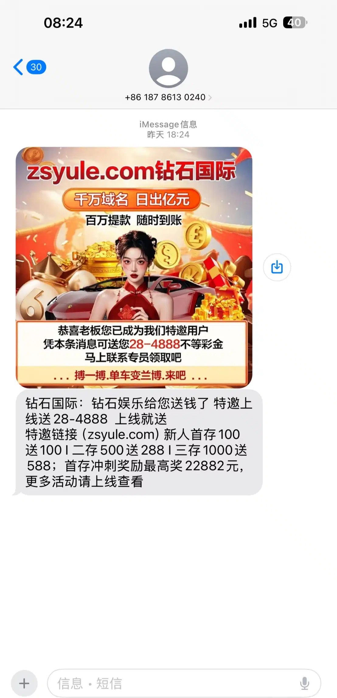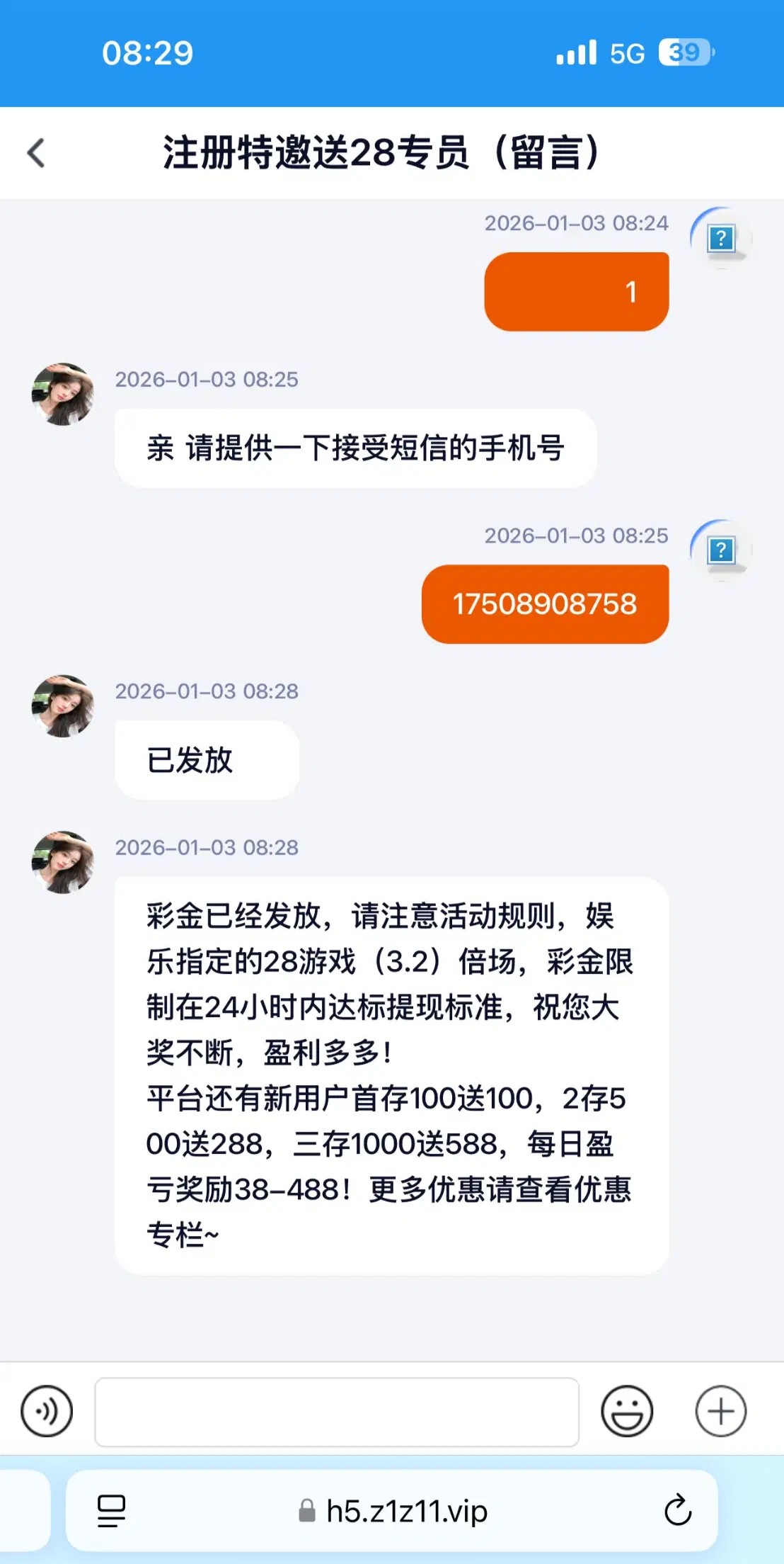 链接zsyule.com 我是之前就注册过了但是没有充值过。然后就发短信过来。领了28只能打3.2的 要打到288才能提  我没有打出来,你们去试一下。没有收到短信的也有新用户送28也是一样的。