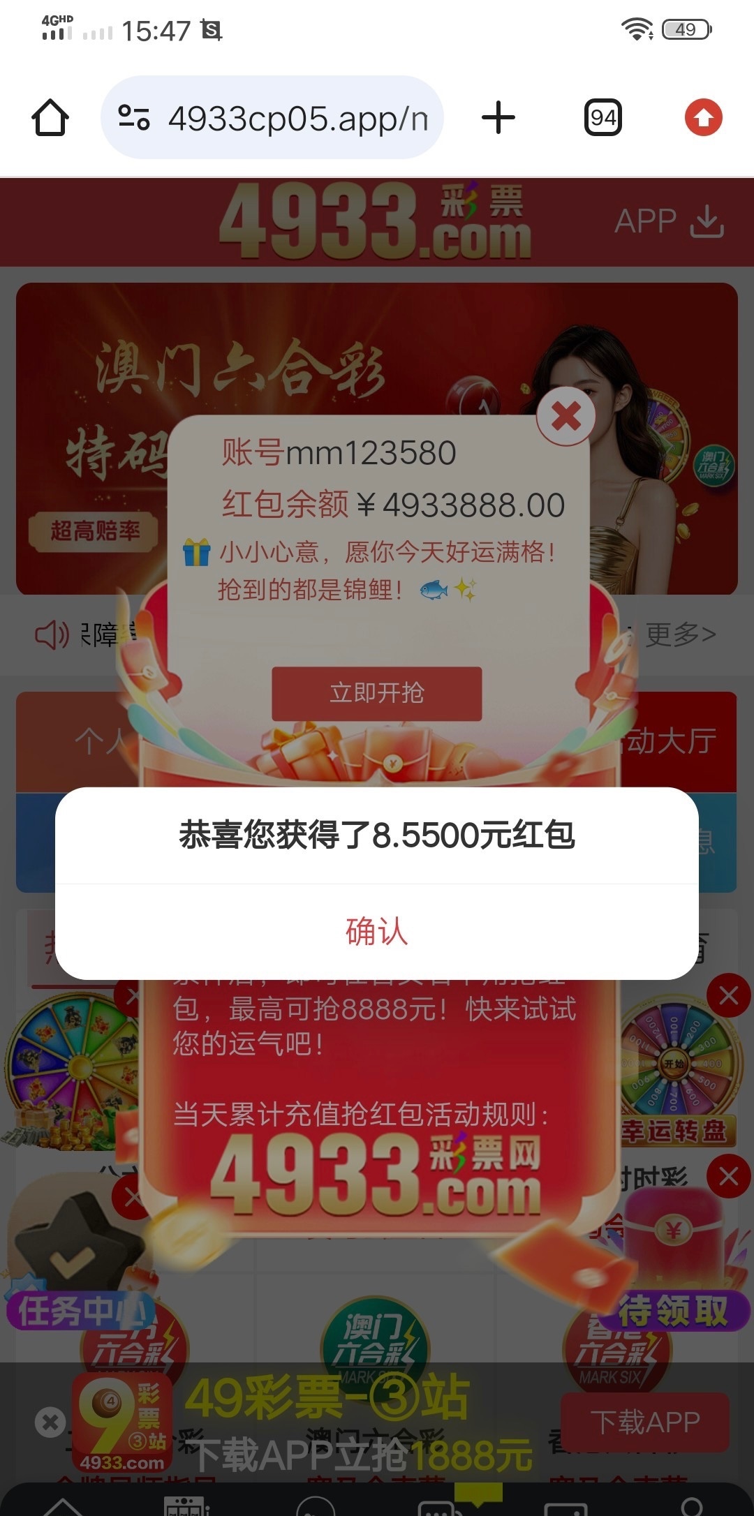 网站4933.com,免费红包有号可以上去看看,就刚出来的时候我充过首存30。今天上去试了一下抢了8块。